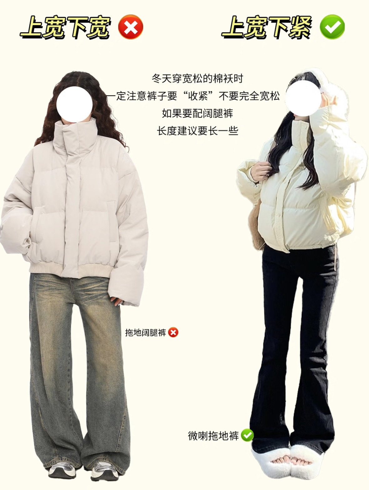 穿搭示范:“短款外套+高腰裤”:短款羽绒服+紧身裤,建议裤脚盖住鞋面,腰线提到肚脐上,腿长直接加5cm。