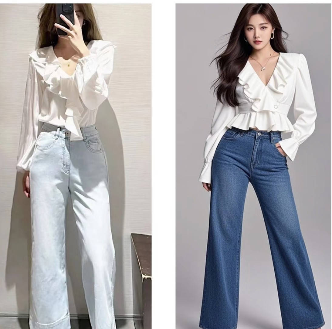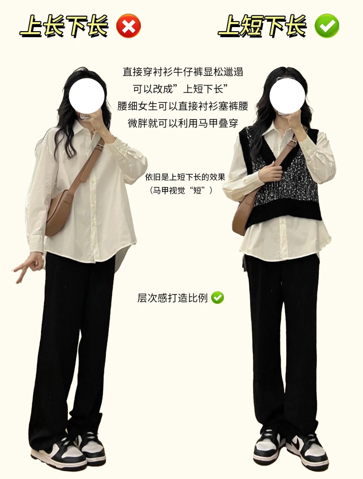 比如A字牛仔阔腿裤+短款衬衫。牛仔裤的长度到腰线,这种“上短下长”比例直接拉成3:7,158cm也能穿出大长腿。