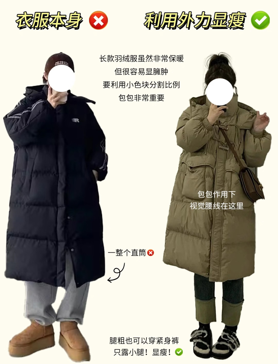 保暖的厚衣服,利用包包显瘦冬天比较寒冷,一件长羽绒服是必备。那么怎么不显得那么臃肿呢?首先材质要挺阔外,还可以悄悄采用小色块来分割,比如一个小的包包就能做到,把视觉腰线放在包包处,视觉显高。也可以避免“里三层外三层”的膨胀感。