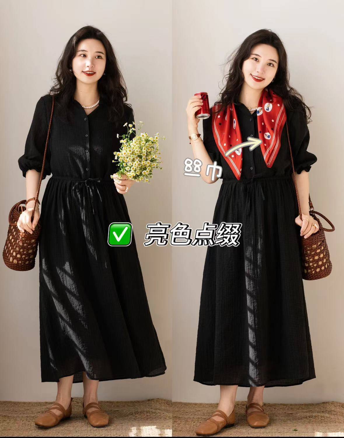 怕亮色显胖?试试“局部点缀”!瞧时尚博主就巧妙的利用一条红丝巾,把全黑色的连衣裙瞬间点亮,并且亮点集中在上半身,视觉重心上移,谁还看你的肚子?这种小面积亮色的点缀,既打破黑色沉闷,又不会像大花一样“炸开”显壮。姐妹们,值得学习。