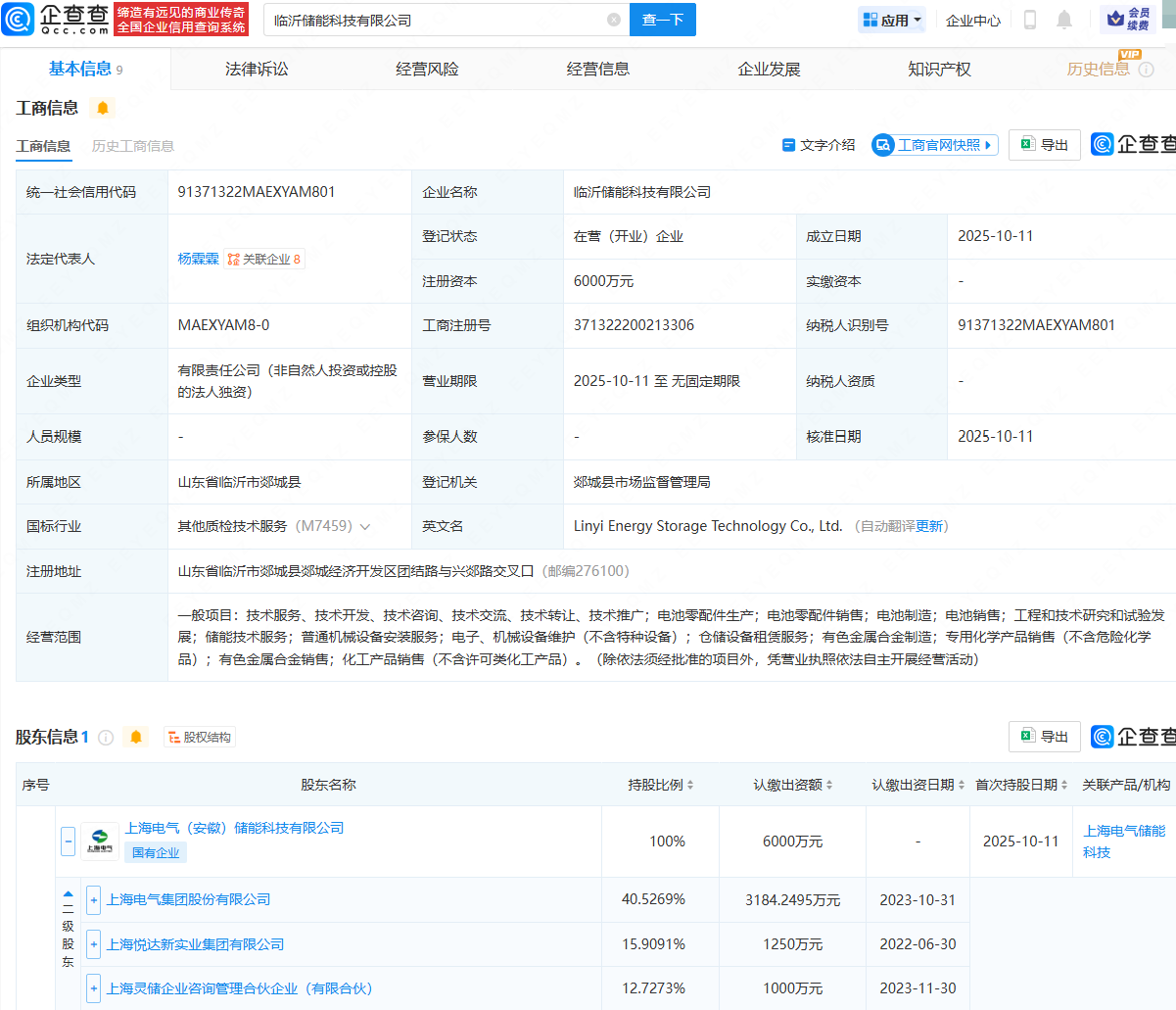 近日,临沂储能科技有限公司成立,法定代表人为杨霖霖,注册资本为6000万元,经营范围包含:电池零配件生产;电池零配件销售;电池制造;电池销售;工程和技术研究和试验发展;储能技术服务等。企查查股权穿透显示,该公司由上海电气(安徽)储能科技有限公司全资持股专业配资服务,后者由上海电气(601727)、上海悦达新实业集团有限公司等共同持股。