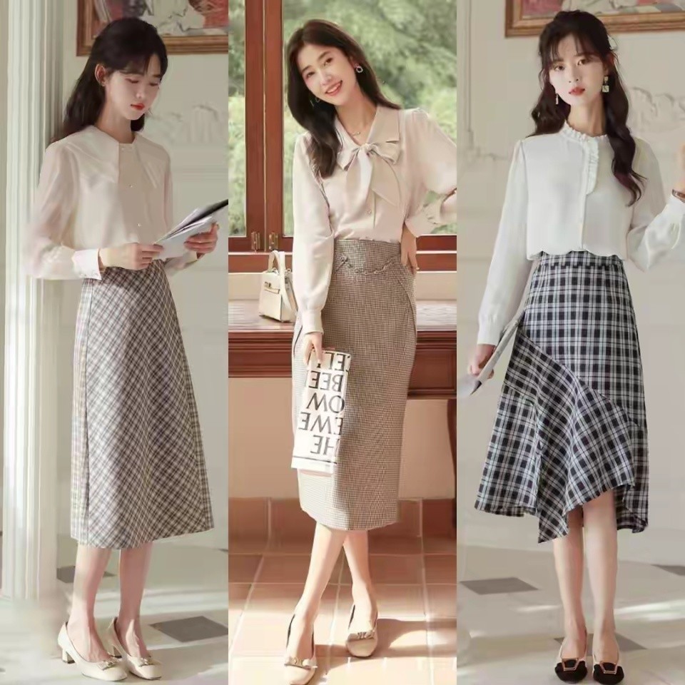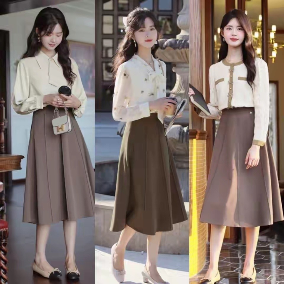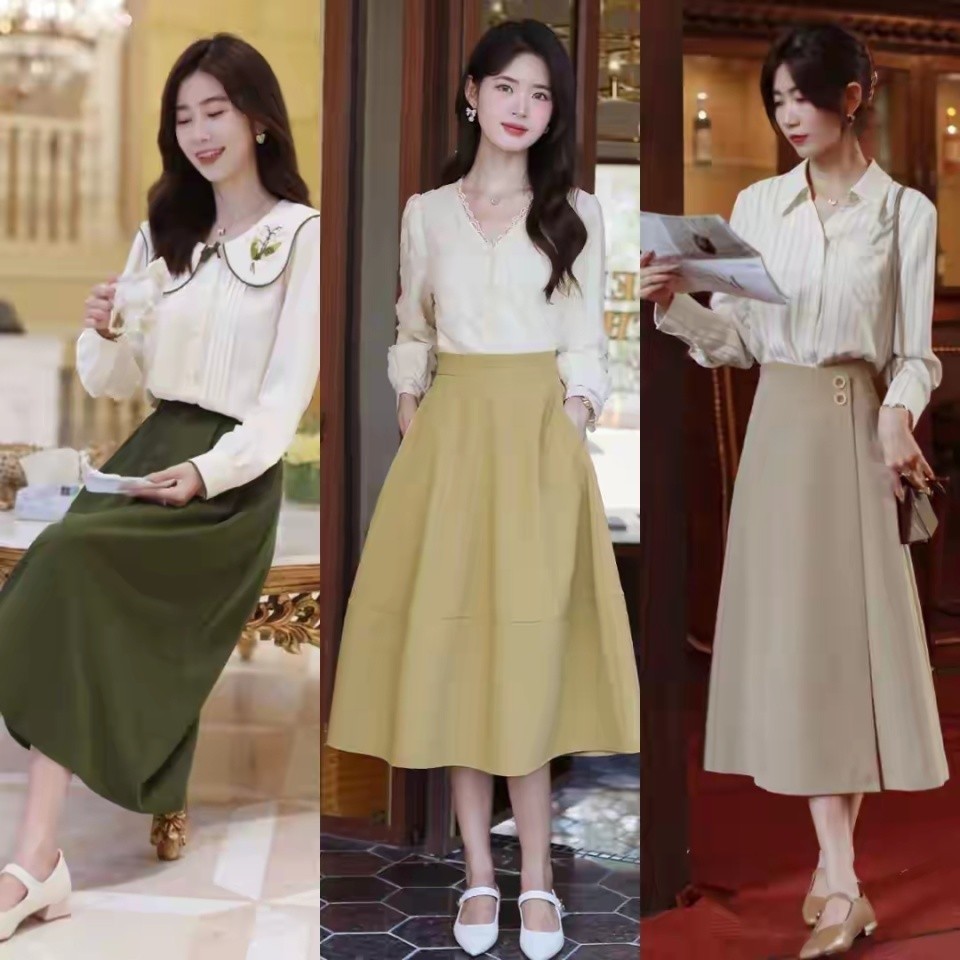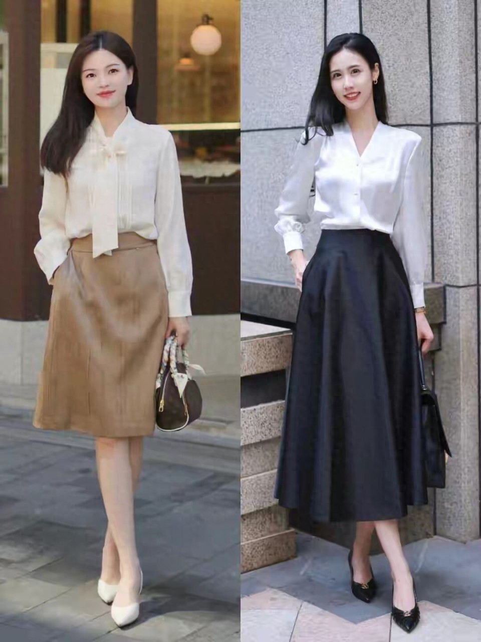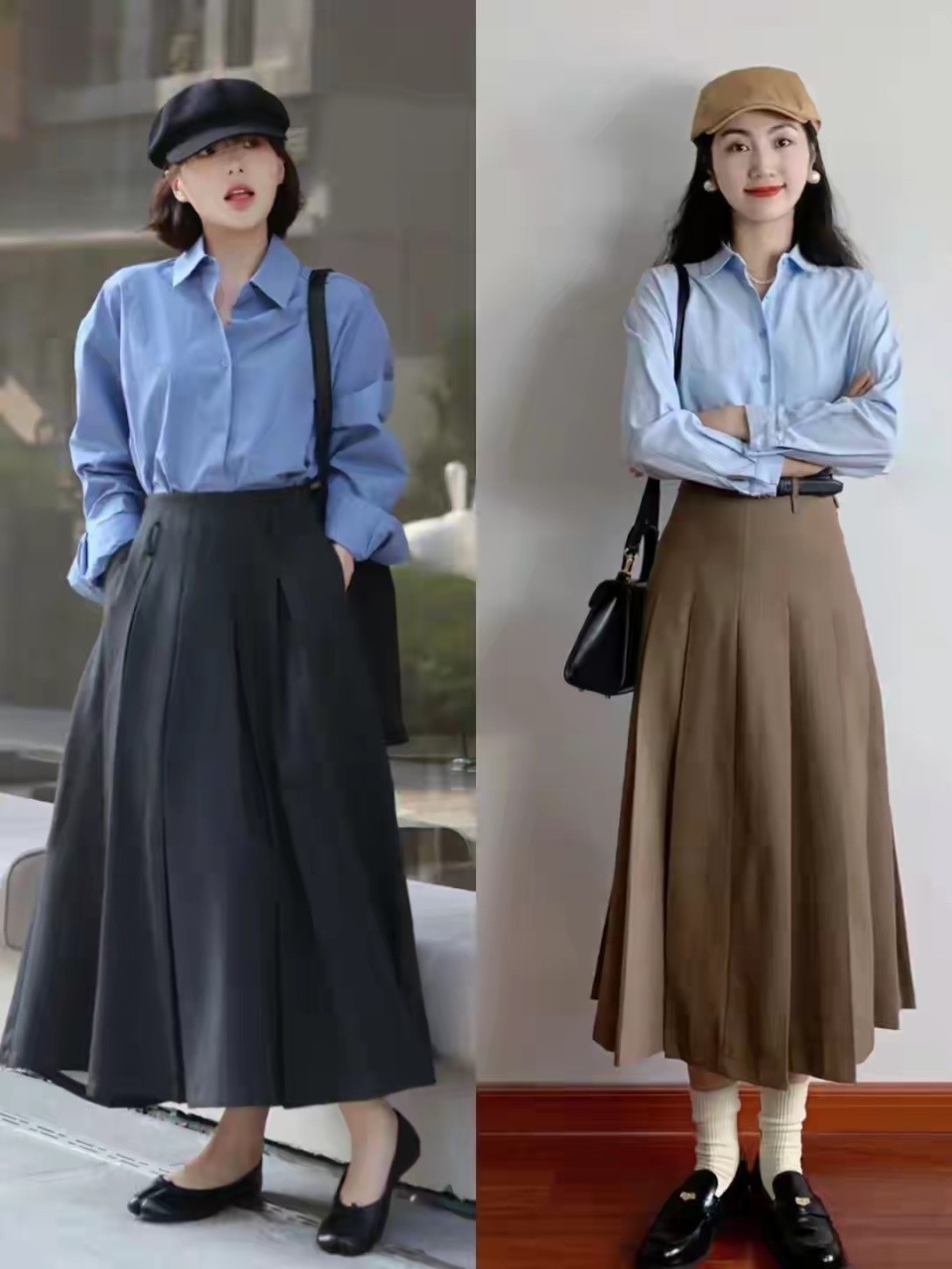 接着咱们再来看下面这一件浅蓝色的衬衫上衣搭配上灰色的压褶半身裙或者是卡其色的压褶半身裙,我觉得这是高矮胖瘦的,可以穿,要比白这个裙看起来更显年轻。