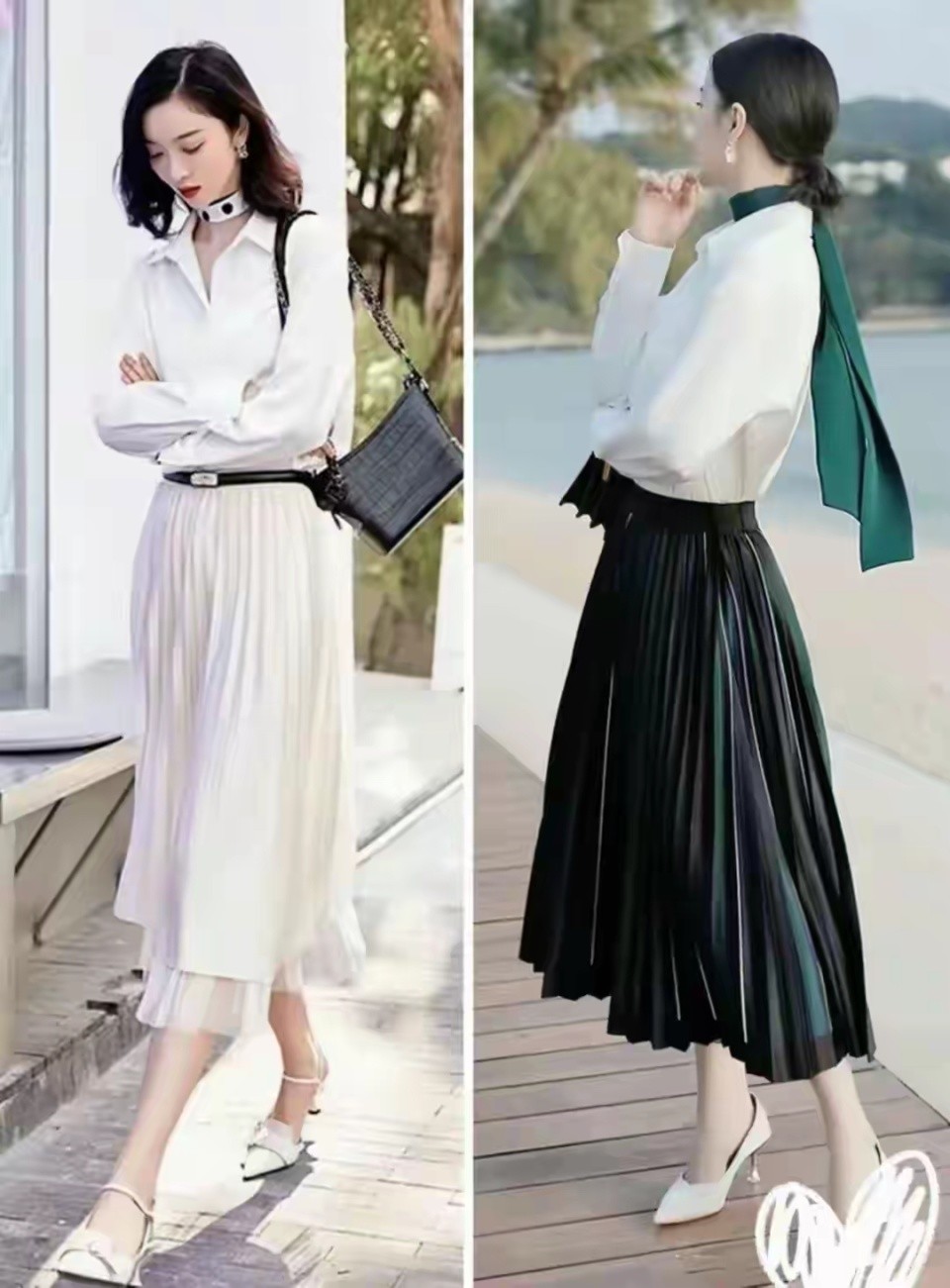 对于个子比较高,长相偏成熟的女性,比较推荐大家选择百褶半身裙,百褶半身裙属于伞状的设计,穿的时候能够把胯宽腿粗这样的问题藏起来,特别是梨形身材的女性,非常推荐选择下面这种比较有垂坠感的白色半身裙来搭配上一件白色的衬衫,是可以选择低跟的凉鞋,或者是细高跟的浅口单鞋,这样的搭配确实更有气质。