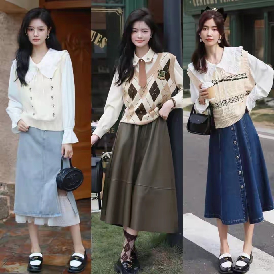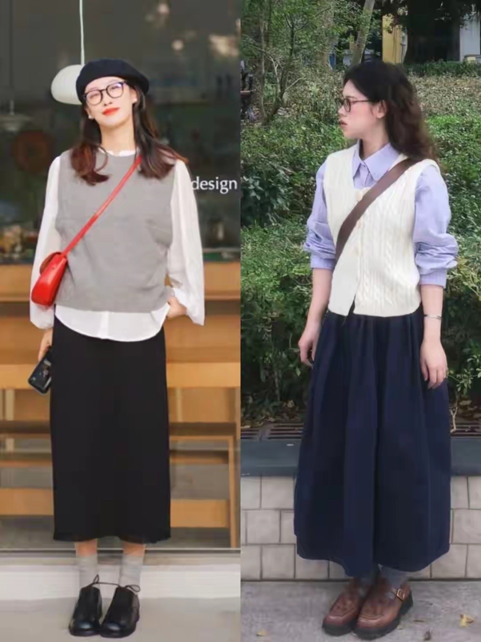 也可以选择下面这种黑白拼接的乐福鞋,搭配上牛仔半身裙,加上针织背心叠穿白色的小众衬衫上衣,这样的穿搭符合00后的美少女。