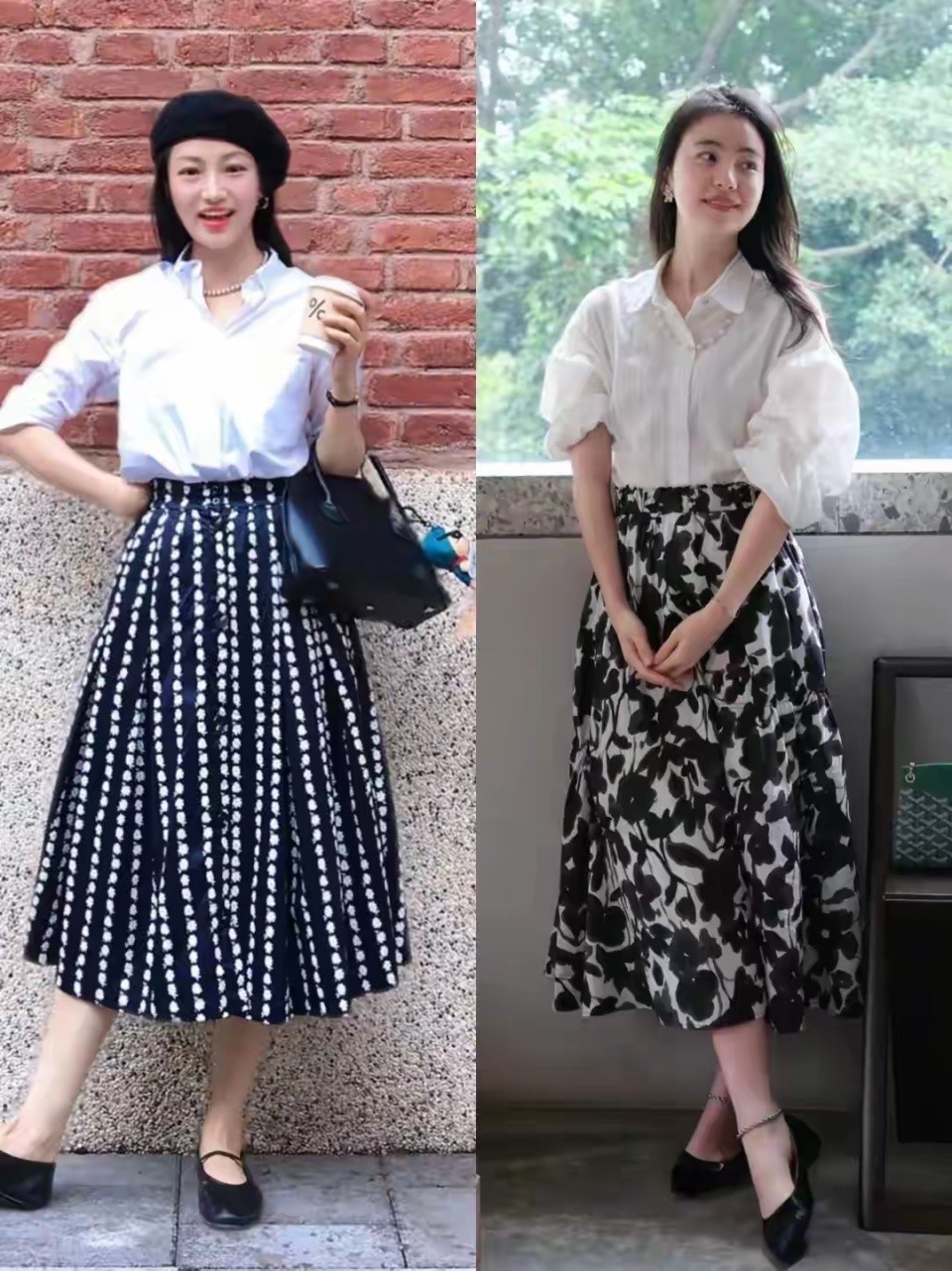 就是用黑白印花的半身裙来搭配,非常符合咱们普通大众,不管是骨架大还是奔三奔四的中年女性,都可以轻松驾驭,例如右边的这一条黑白印花半身裙,眼看上去就很大气,再搭配上一件灯笼袖的衬衫上衣,轻轻松松穿出简约大气的造型,不管穿去上班,逛街,约会都没有任何问题,通勤时髦。