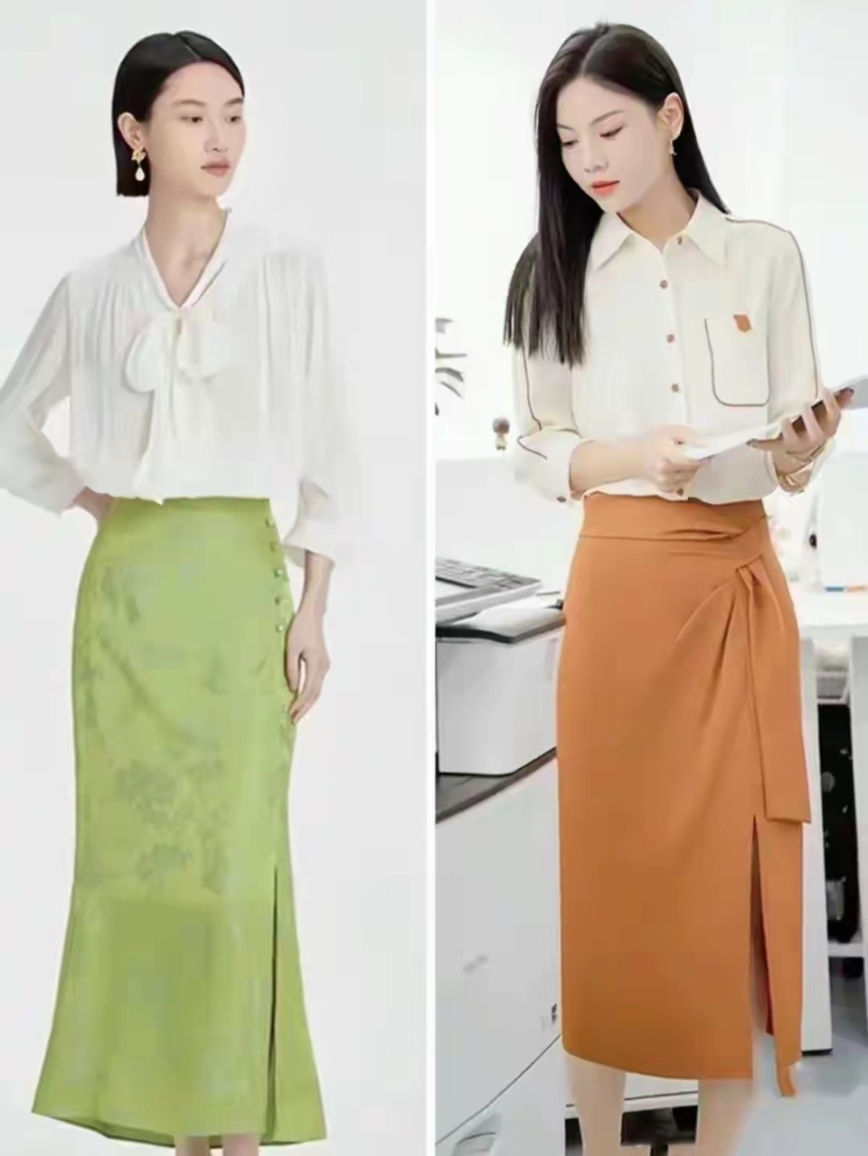 我们自己选择一条高腰收腰款的浅色,又有果色直筒开叉半身裙来搭配就够,能很好的修饰下半身的腿部线条,使得穿搭者身材线条变得更加的流畅。