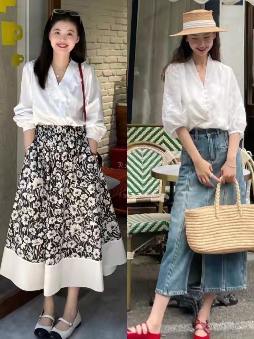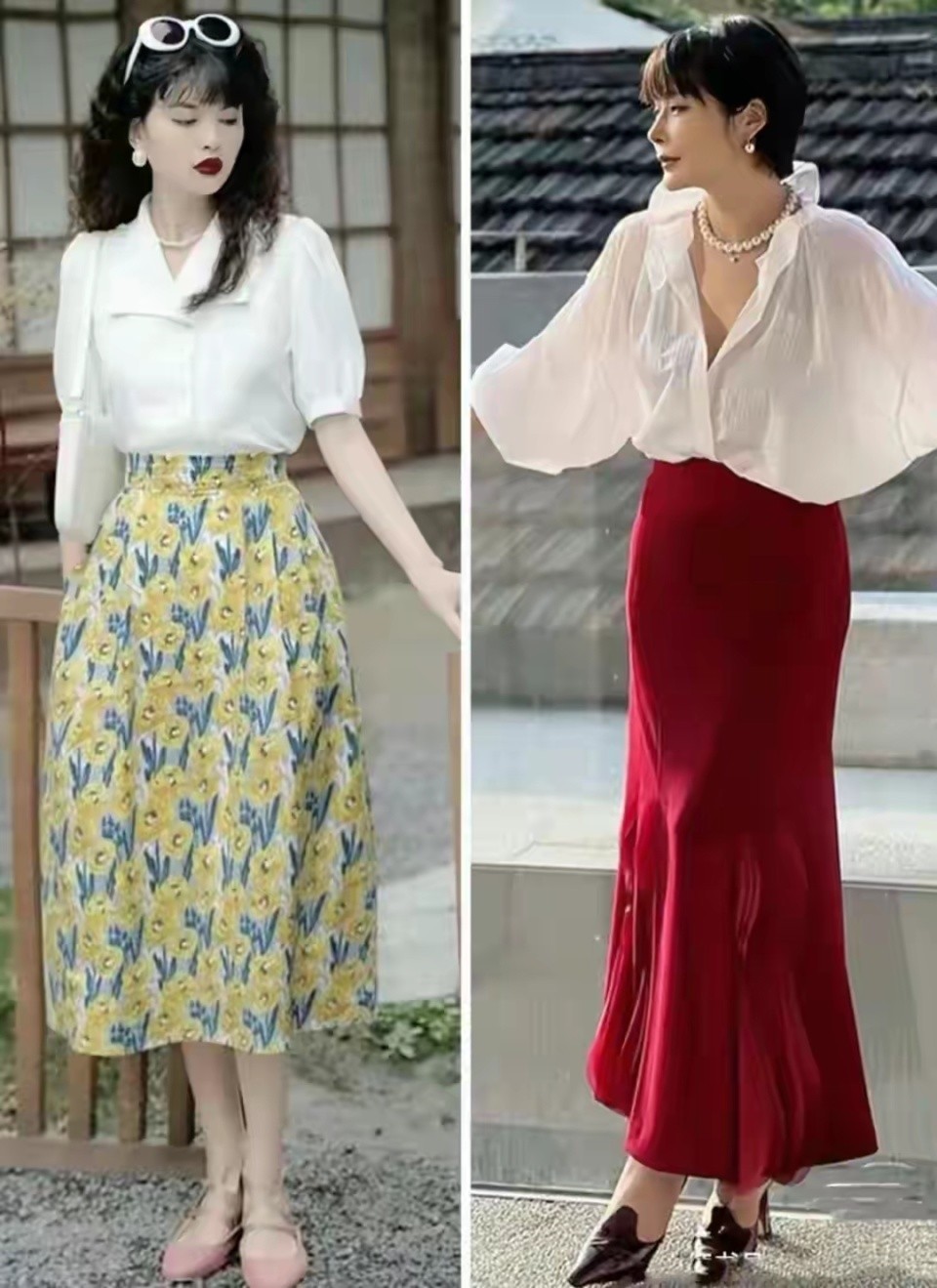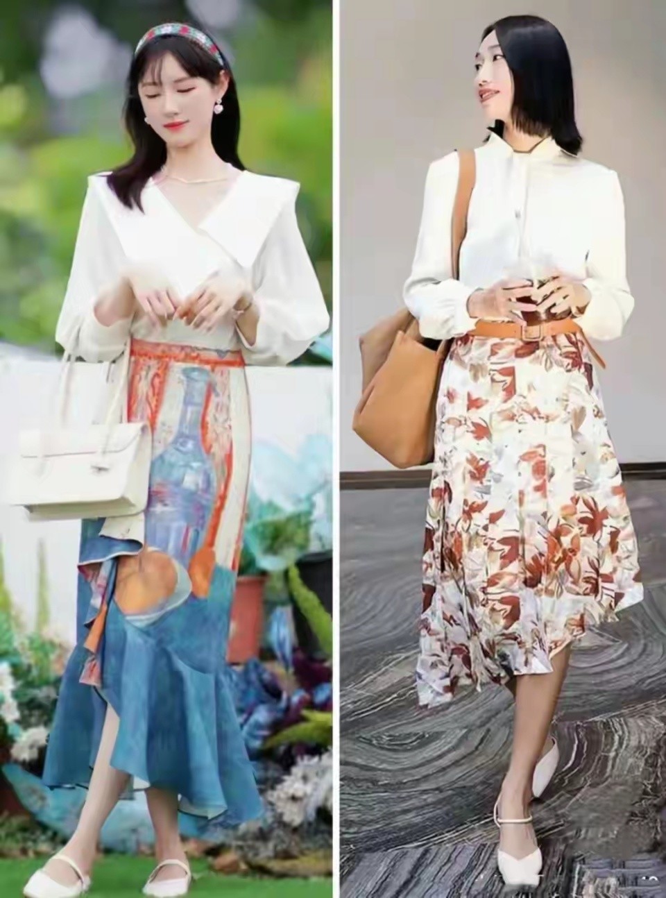 我们还可以选择印花的半身裙来搭配像白色的衬衫上衣,这样的穿搭也属于繁简结合的搭配,不过如果衣服印花比较繁杂,这个时候尽量选择放在下半身,这样看起来才不会显得凌乱,就像下面这两位达人选择了印花半身裙,色调就会比较多,如果你换成是这样色调的印花衬衫,穿起来肯定没有这样的搭配好看。