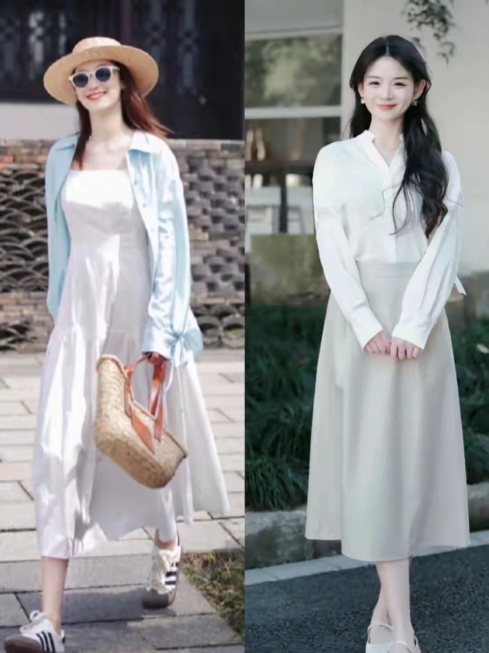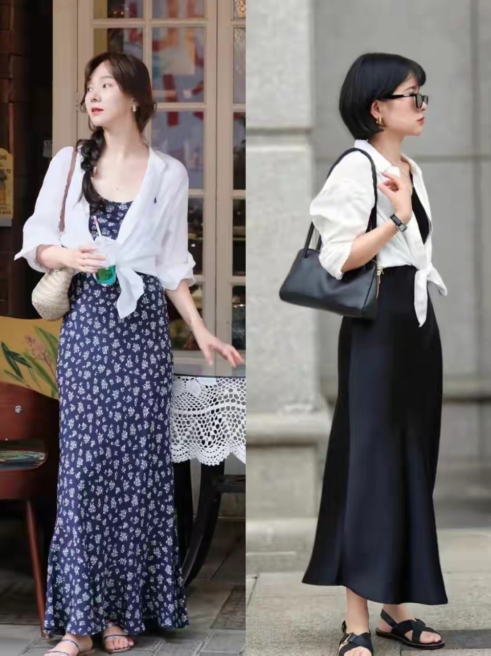 当然啦,除了以上这些搭配之外,我们还可以用连衣裙来搭配,例如下面这一条印花的吊带连衣裙,穿在身上就比较有垂坠感,再加上一件白色的衬衫作为外套形成的外搭的搭配,能够使得穿搭者的身材比例形成一个三七分。