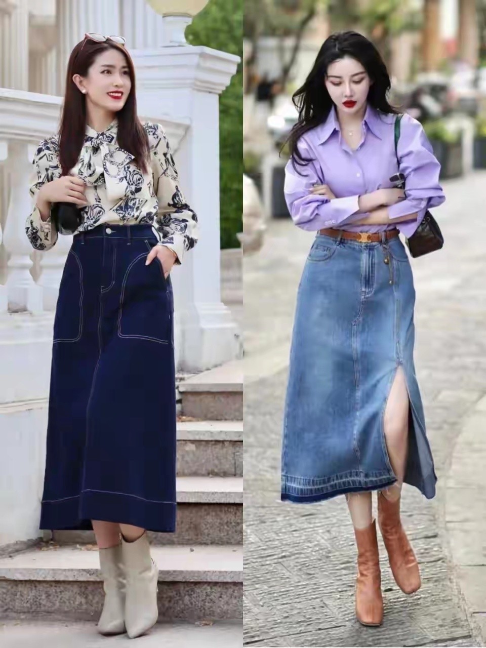 有的时候我们可以选择繁简结合的穿搭技巧,简单的理解就是有一件衣服是印花的设计,例如左边的这套穿搭就选择了一件印花的衬衫,上面的搭配上纯蓝色的牛仔a字半身裙,脚上穿的一双皮质的短靴,这样的穿衣打扮显得精致时髦,而且休闲又洋气。