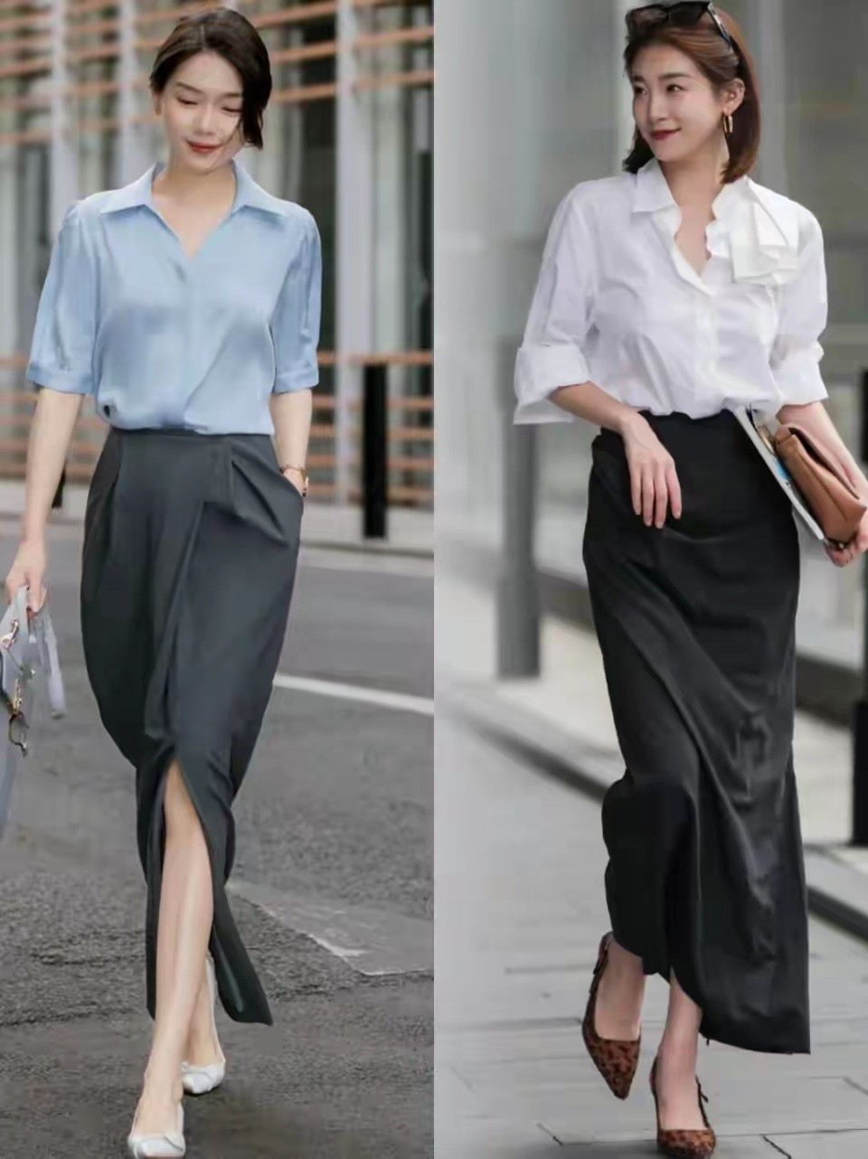 想要变得更加高级大气,衣服面料自然少不了,比如下面用一件浅蓝色的免烫款式衬衫,上衣搭配上灰色的开叉半身裙,一眼看上去就很显贵,原因很简单,因为她选择的衣服面料是比较有品质的,而且衬衫上衣还属于免烫的材质,穿一天也不容易,起毛起球起褶皱,下半身的这一条半身裙面料挺括有型,穿在身上确实能更好的修饰身材线条。