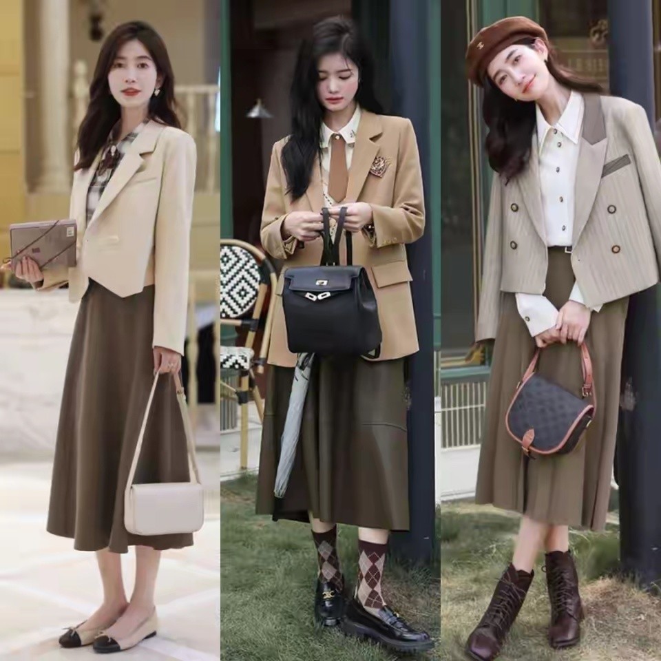我们还可以选择棕色的短靴,或者是拼接式的前扣玛丽珍鞋搭配上卡其色的半身裙和一件西装外套,这样的穿衣打扮非常时髦,还显得年轻有活力,试问谁不爱这样的穿衣造型呢?